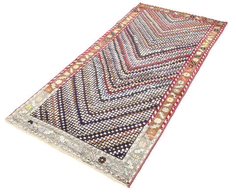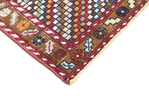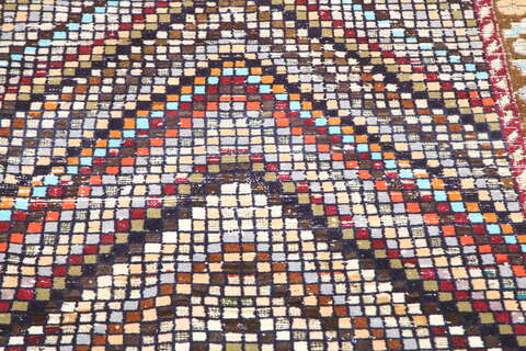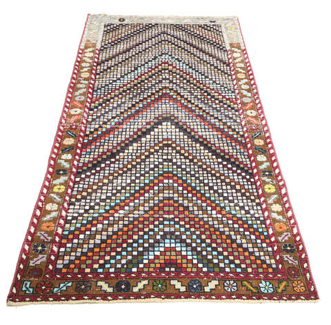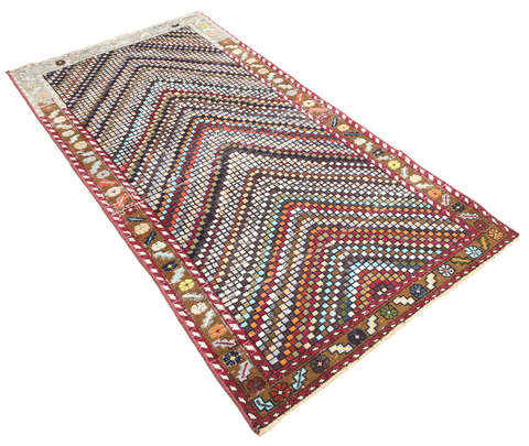 This carpet is knotted by nomads and semi-nomadic Ghashghais in southwestern Iran. The carpet is known for their primitive, naive patterns with rustic charm. The nomads get their inspiration from the environments around them, which gives a modern and exciting carpet. The wool is generally of good quality.