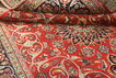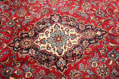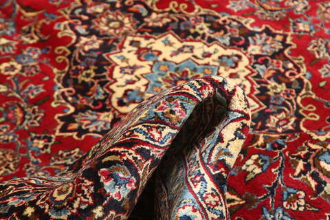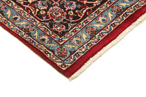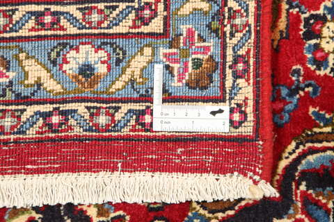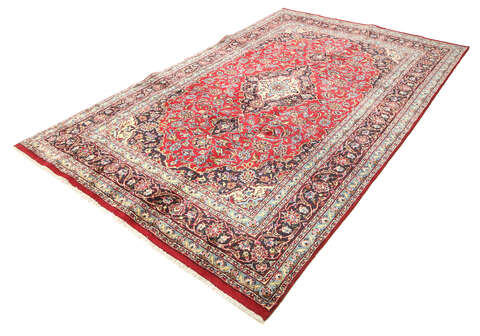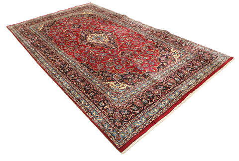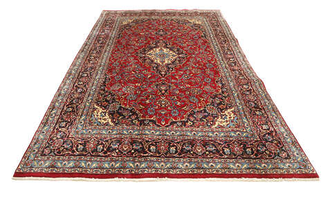 This carpet is knotted in Mashad the capital in the province of Khorasan, an area in norteastern Persia. The patterns are often medallions in dark blue-red and blue nuances and the wool in the carpet is very soft. The Mashad carpets often resemble some Keshan carpets.