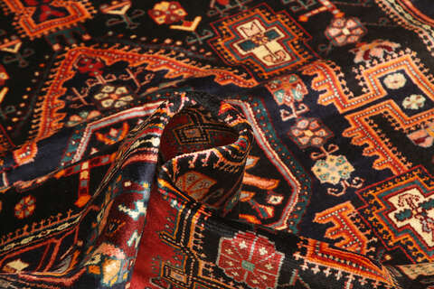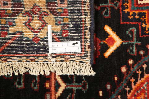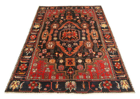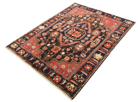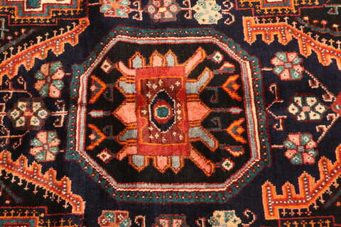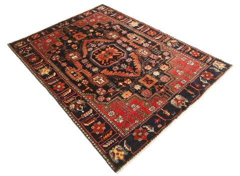 This carpet is knotted in the Hamadan area in northwestern Persia. The carpet is characteristically coarsely knotted with shiny wool of high quality. The colours are usually red or blue with pattern consisting elements of nomadic and geometric motifs. Medallions can also occur.