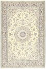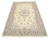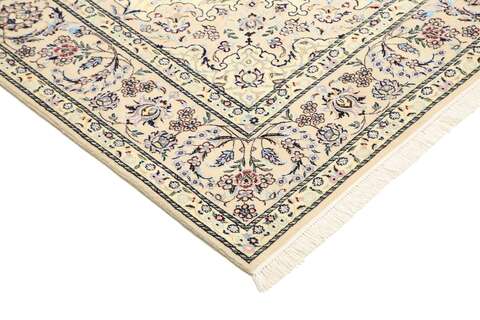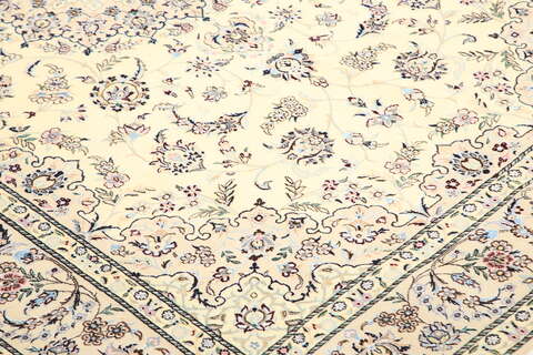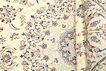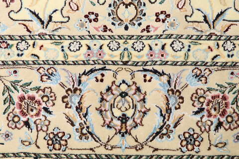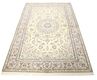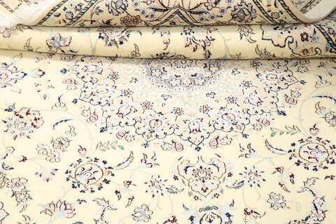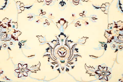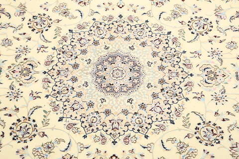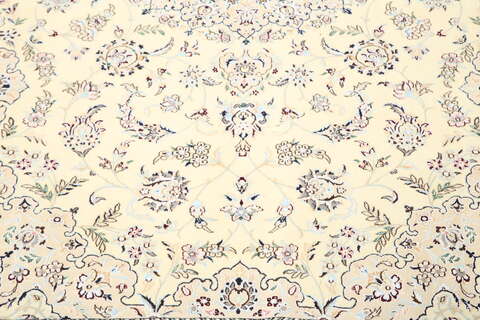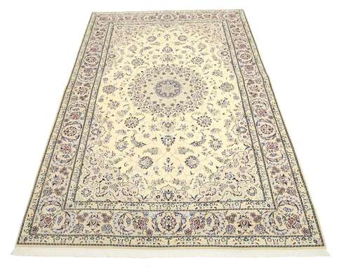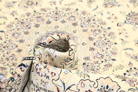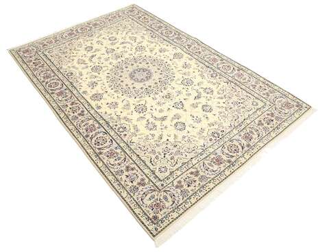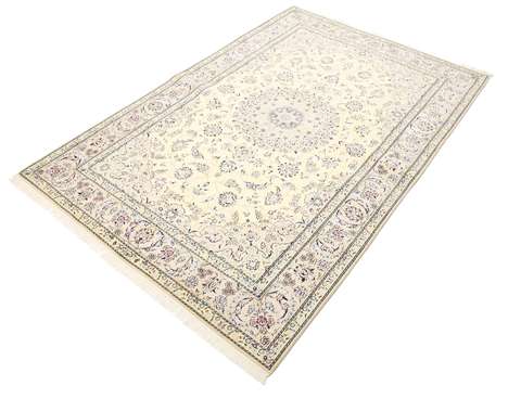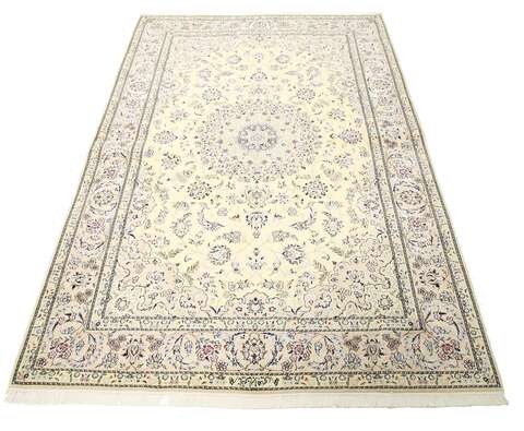 This carpet is knotted in workshops in the city of Nain in central Persia, near Isfahan. The carpet is generally very light with a cream-coloured or deep-blue bottom colour and a large medallion in the centre. The high knot density and high class material makes these carpets of very high quality. Silk might occur and 6La means that three pairs of threads are used for every warp thread. They are manufactured in most sizes and the carpet is among the most beautiful in the world and very popular among collectors.