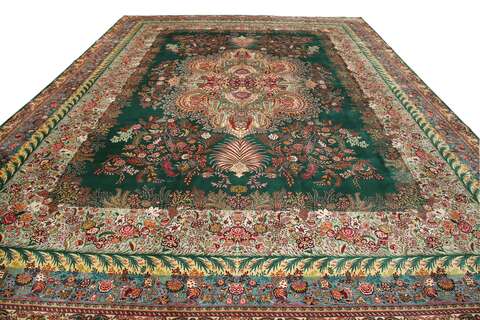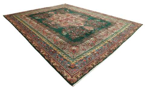 This carpet is knotted in workshops in the city of Tabriz in northwestern Persia. It is a sturdy durable carpet with a short rough pile. The patterns can consist of a centrally placed medallion surrounded by arabesques, weeping willows and cypresses. Another popular motif is the four seasons, describing the Persian farmers life during spring, summer, autumn and winter.