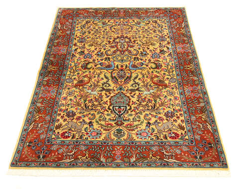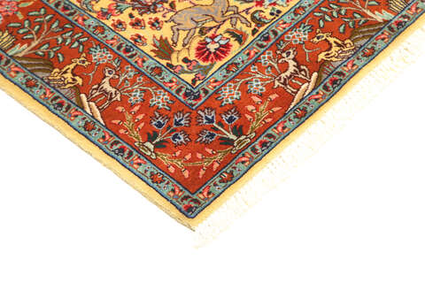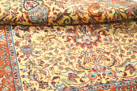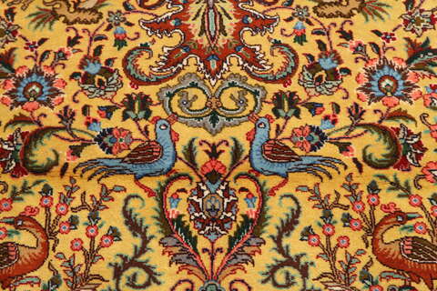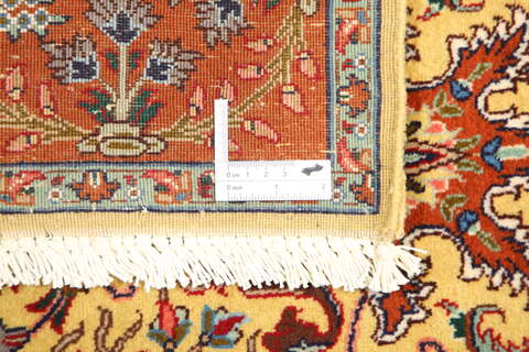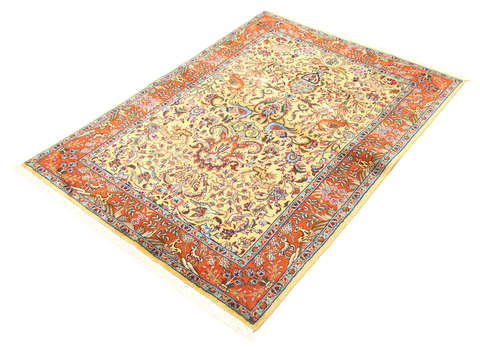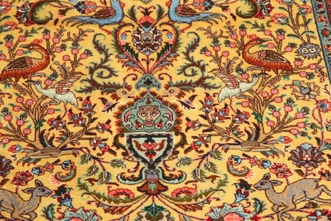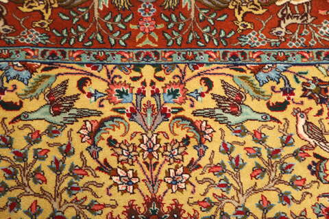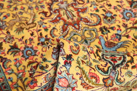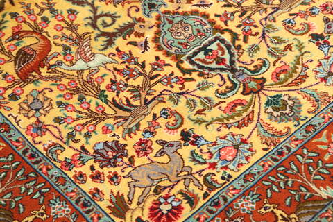 This carpet is knotted in workshops in the city of Tabriz in northwestern Persia. It is a sturdy durable carpet with a short rough pile. The patterns can consist of a centrally placed medallion surrounded by arabesques, weeping willows and cypresses. Another popular motif is the four seasons, describing the Persian farmers life during spring, summer, autumn and winter.