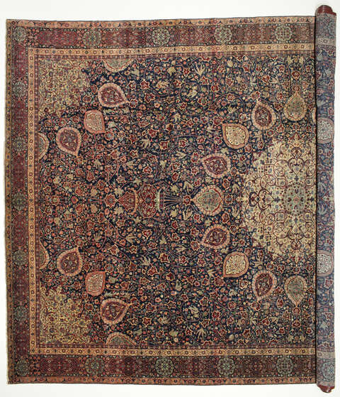 The carpet set on a dark blue background with floral motifs has a cotton foundation and wool pile. The design closely follows the original Ardebil carpet and is composed of a central medallion with two identical lamps handing from the centerpiece. The same designs present in the medallion are also used in the corner pieces.