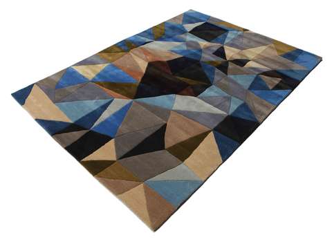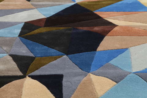 The Volcano Rug was created by shining different coloured lights onto a three-dimensional polygonal surface. This was inspired by the play of light and shadow on rocks at dawn. This method can be used to create numerous patterns that are different in colour and shape.